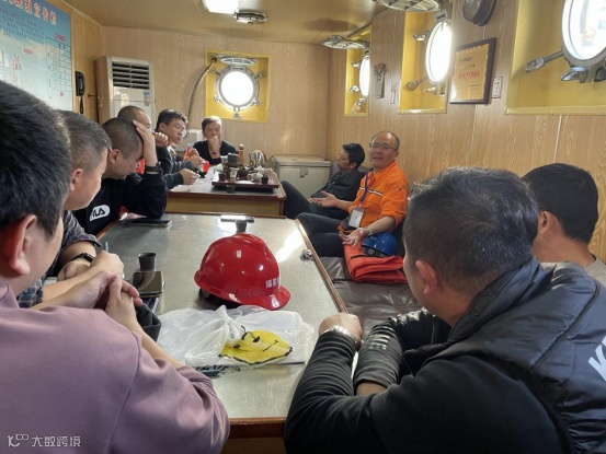 2020年12月30日,福港拖轮副总经理李柏然在元洪码头为一线船员现场宣讲十九届五中全会精神及安全法律法规知识。