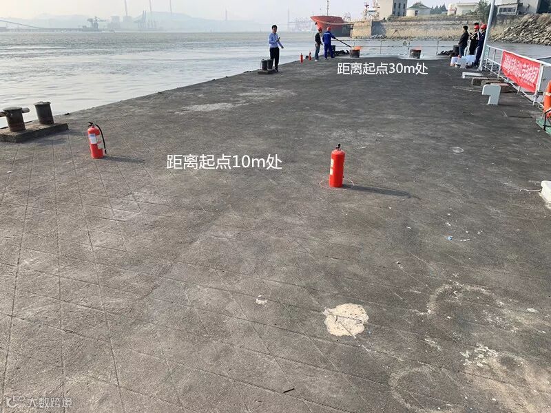 在离起点线30米处放置一个油桶,桶内盛有柴油及稀释剂等,为着火处。