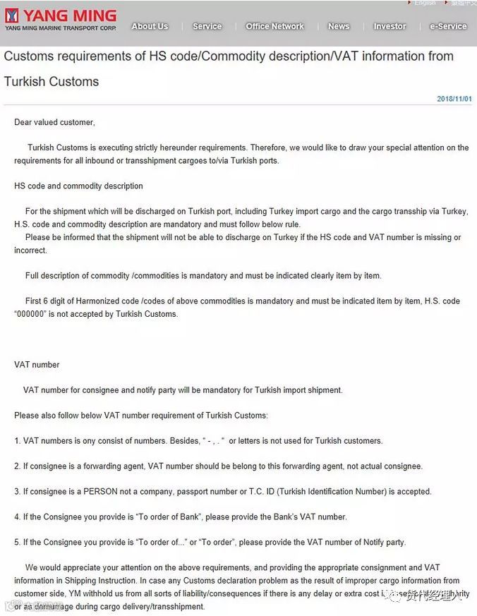 土耳其海关新的要求船公司已经发布通知,并表示在装运指令中必须提供适当的托运和增值税信息,如果因客户方提供的货物信息不正确而导致报关问题,船公司将在货物交付/转运过程中因任何延误或额外费用或滞期费不承担任何责任和后果。