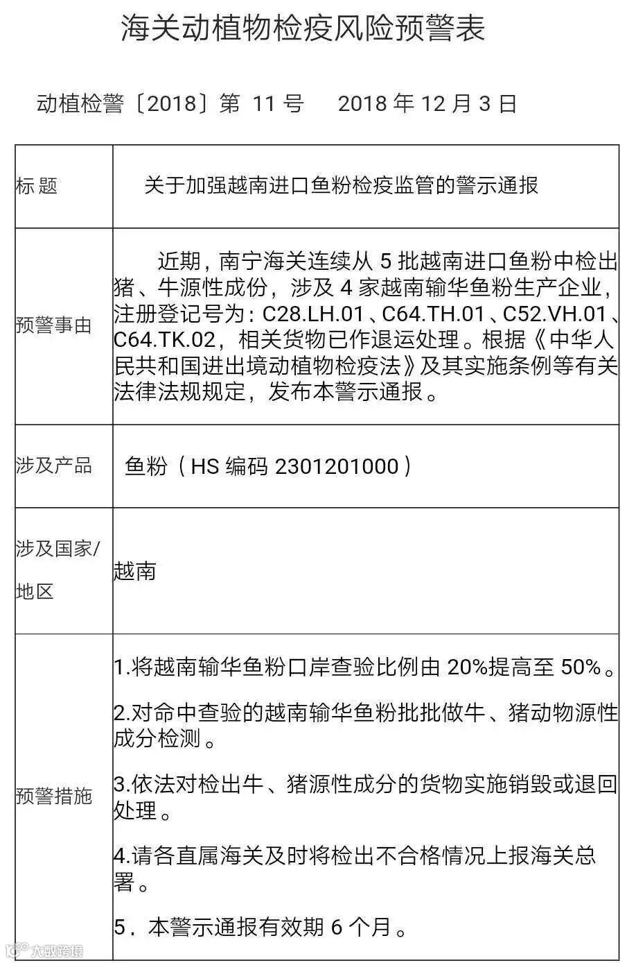 将越南输华鱼粉口岸查验比例由20%提高至50%;