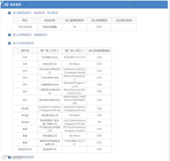 点击“更多税率”,选择“进口反倾销税税率”,下拉显示该商品名称不同原产国和原厂商的进口反倾销税税率。