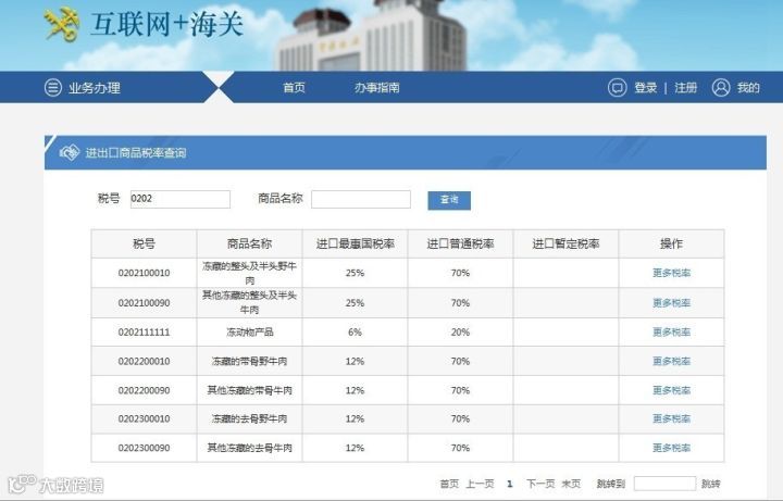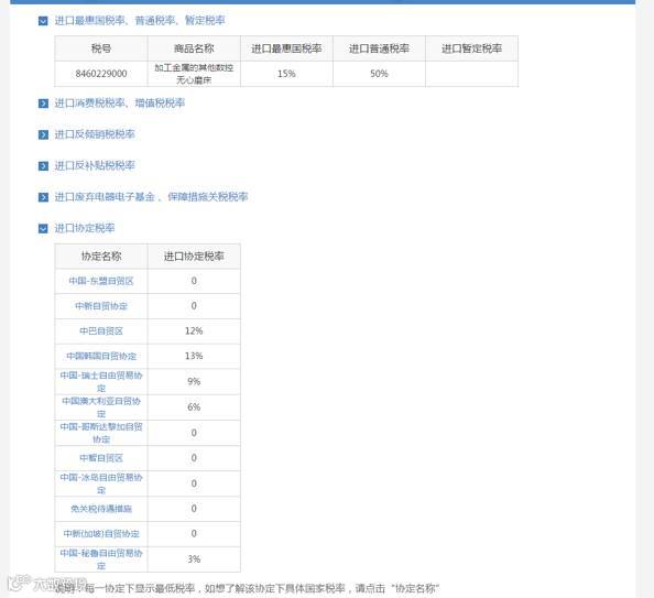 点击“更多税率”,选择“进口协定税率”,下拉显示该商品名称的所有协定税率。