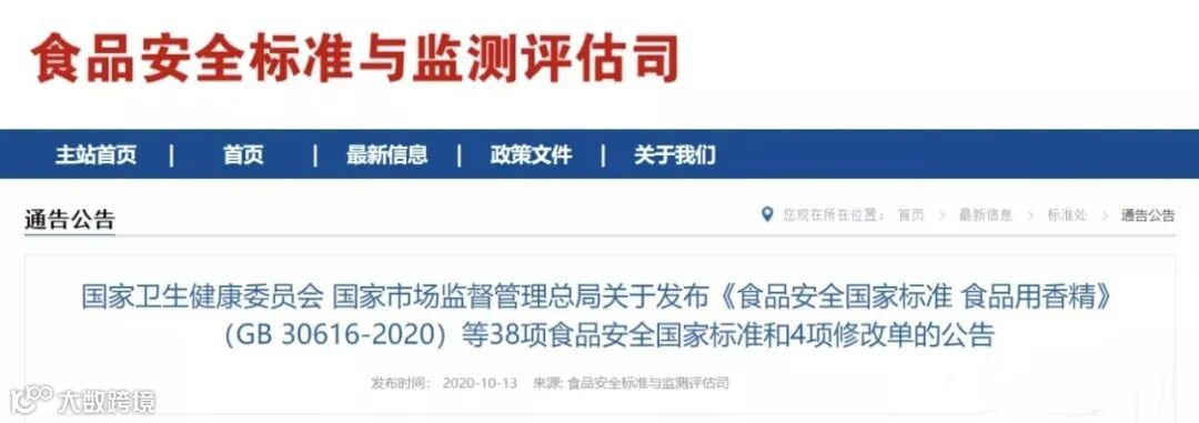2020年10月13日,根据《食品安全法》规定,国家卫生健康委、市场监管总局联合发布2020年第7号公告,发布42项新食品安全国家标准。