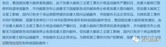 受此事件影响,包括中国邮政、敦豪小包、速卖通、亚马逊、eBay等都受到影响。近期,有准备向加拿大寄送货物的小伙伴,请务必留心,提前和收货人确认,找寻其他替代的物流渠道!