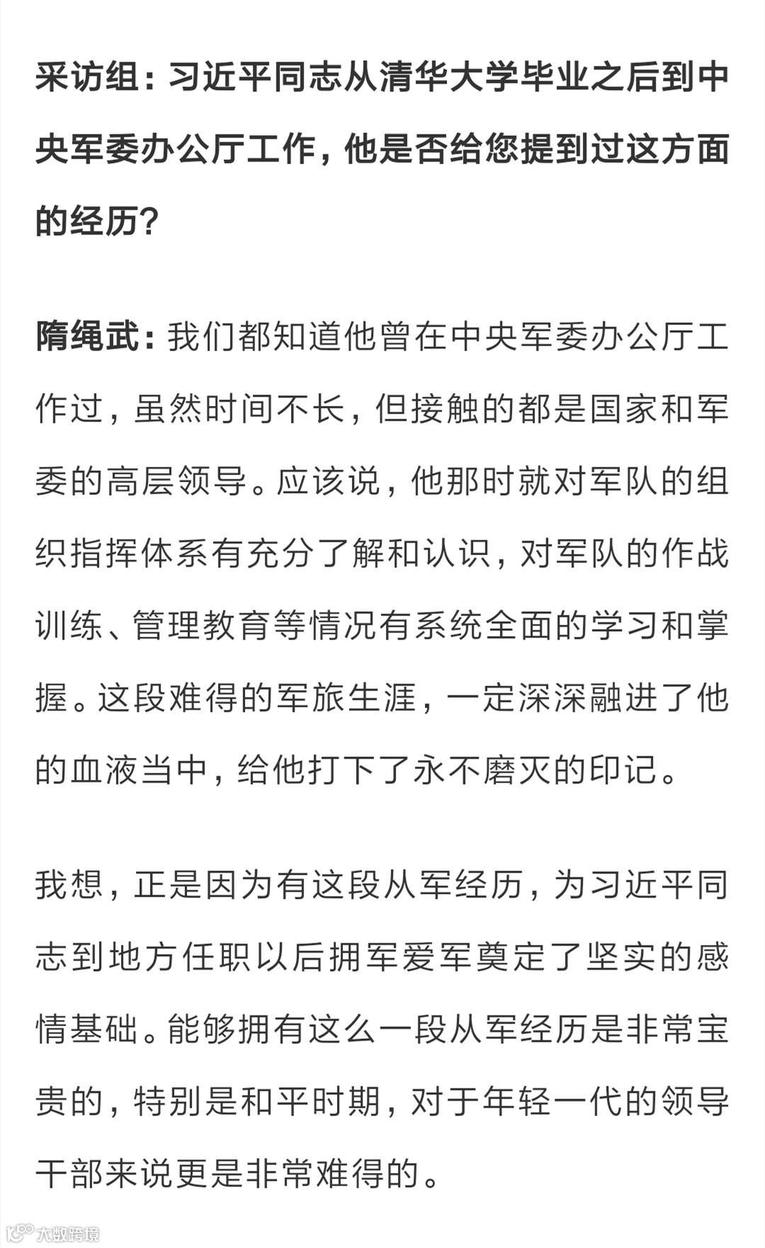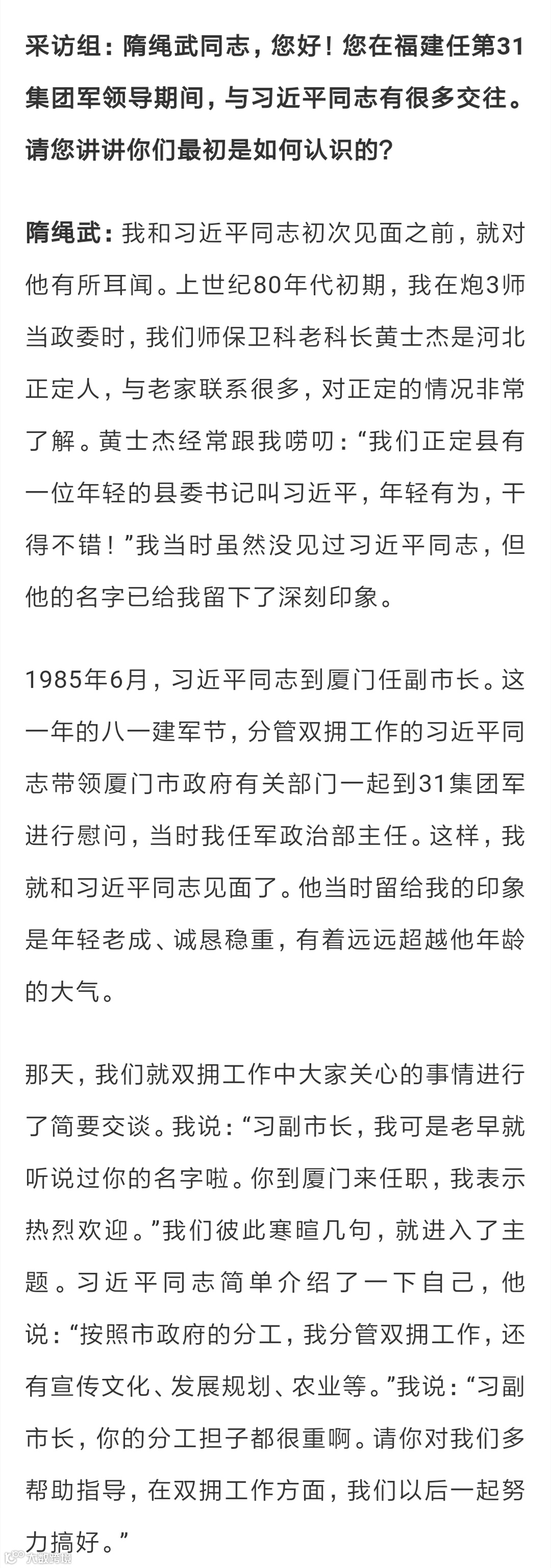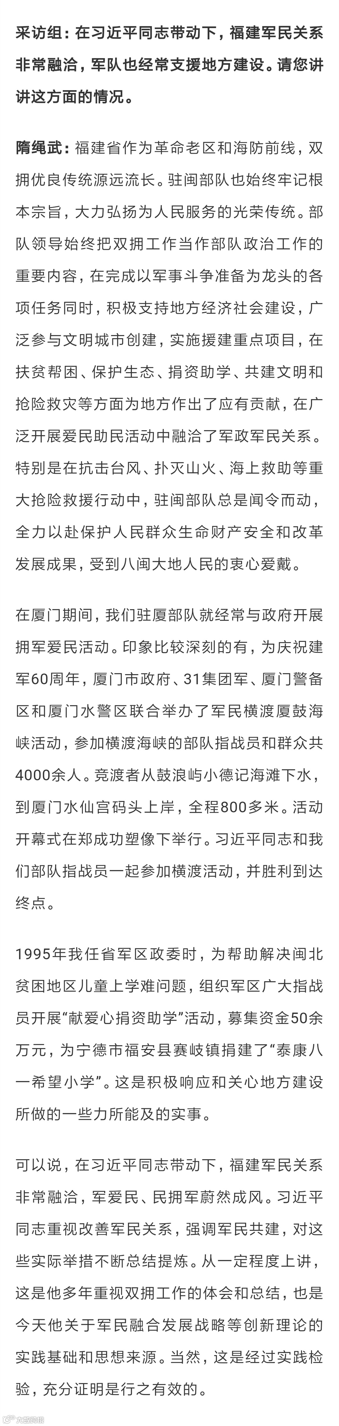 采访对象:隋绳武,1941年8月生,山东寿光人。1959年入伍,1960年入党。曾任炮3师政委、陆军第31集团军政治部主任、南京军区政治部副主任、福建省军区政委、中国人民武装警察部队副政委。第九届、第十届全国人大代表。2004年退出领导岗位。