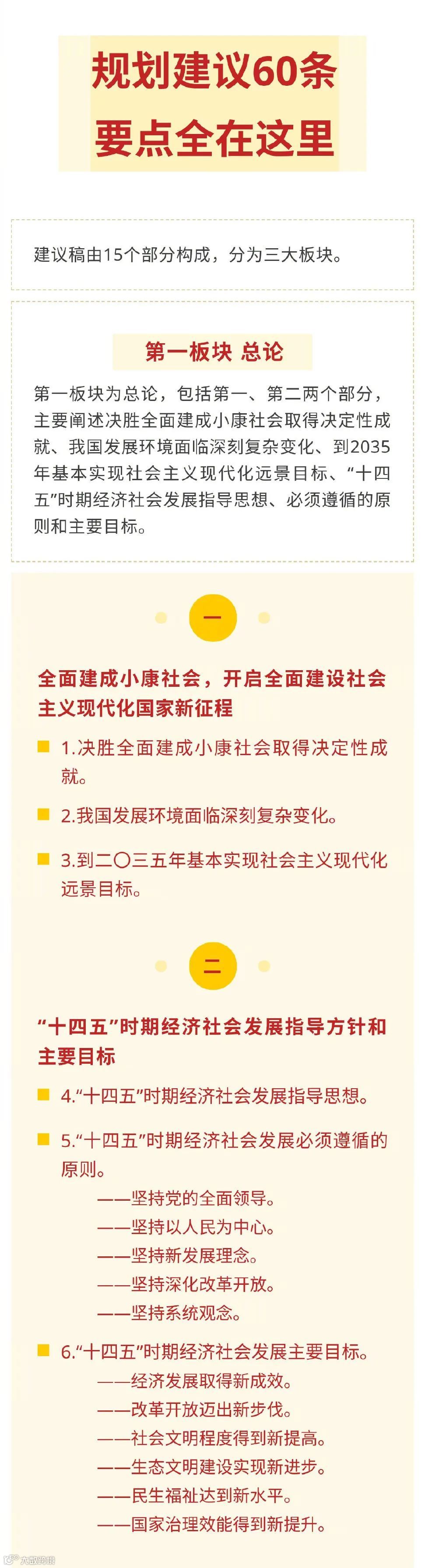 导读:《中共中央关于制定国民经济和社会发展第十四个五年规划和二〇三五年远景目标的建议》共60条要点全在这里↓↓↓来