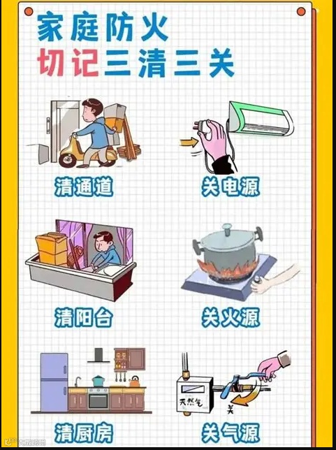 家庭防火要严守“三清三关”:清阳台、清楼道、清厨房可燃物,关火源、关电源、关气源,燃气使用前用肥皂水检查泄漏,油锅起火时用锅盖隔绝氧气而非泼水扑救;