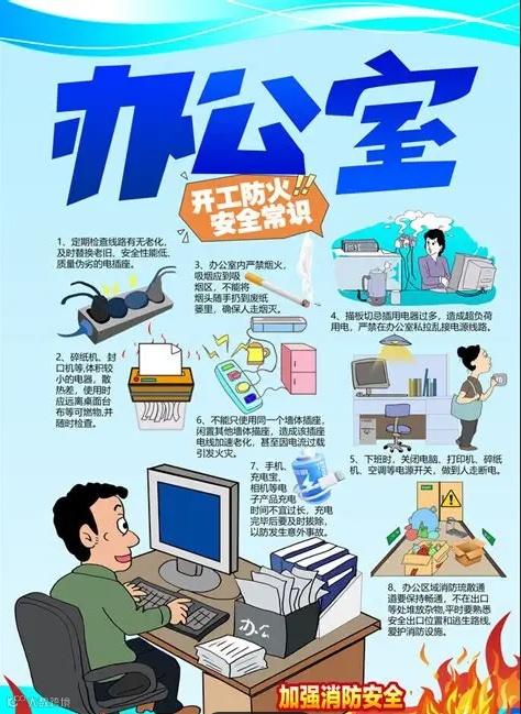 办公场所要杜绝“隐形风险”,大功率电器单独使用专用插座,下班前关闭所有设备电源,文件纸箱不堆放在插座旁,保持消防通道畅通无阻;