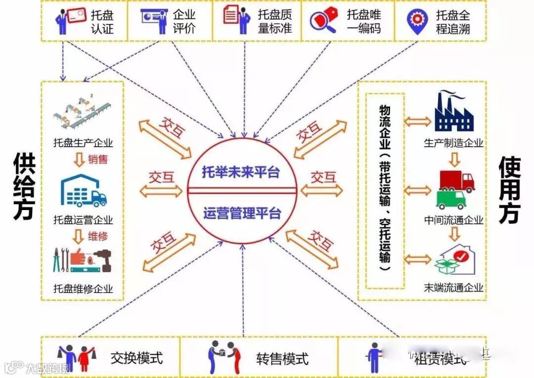 开放式系统:由众多托盘供给企业(生产企业、运营企业和维修企业)、托盘运营网点和托盘运营管理平台、托盘用户共建托盘池,使用经过认证的开放式循环共用的标准托盘,为众多用户共同服务的开放式组织系统。开放式循环共用托盘标准对托盘规格、结构与质量均做了统一要求,并需经过统一认证。在实际运作中,托盘随货物在带托运输过程中通过交换、转售,也包括租赁来实现托盘的循环共用,托盘的所有权往往不停地发生变化。具体如下图所示: