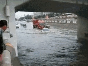 通过经洪水冲击后情况不明的漫水路面或桥面时,要先查明是否形成塌陷、缺口,否则极易造成翻车。