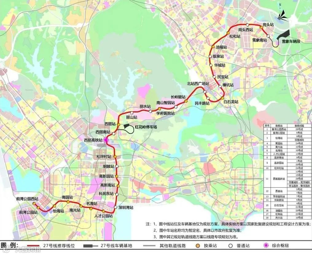 地铁27号线起自前海前湾片区,终止于龙岗坂雪岗片区,预计2028年建成通车。届时,将实现前海、南山中心与龙华中心45分钟通达。