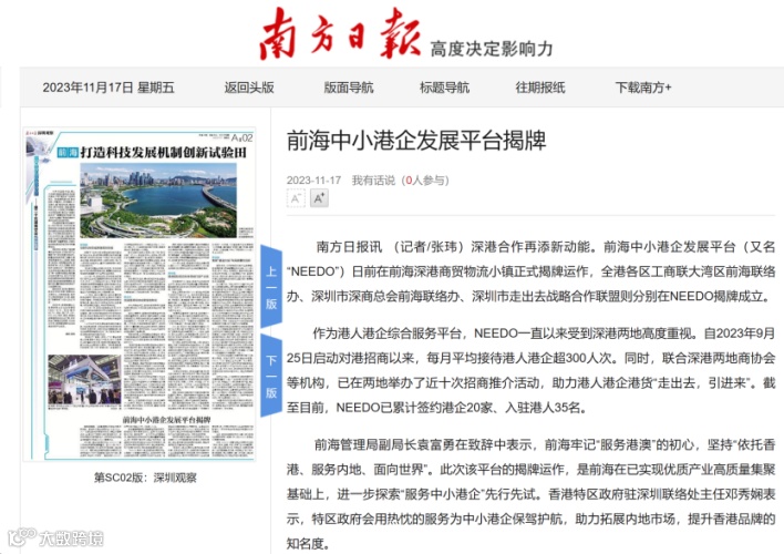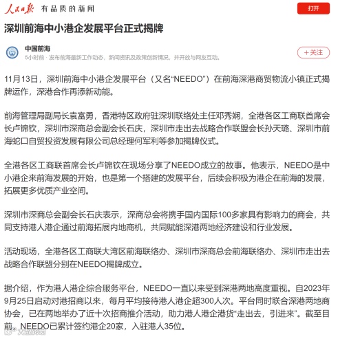 11月13日,前海中小港企发展平台(又名“NEEDO”)在前海深港商贸物流小镇正式揭牌运作。NEEDO的成立将进一步推动深港合作,助力港人港企融入大湾区发展。