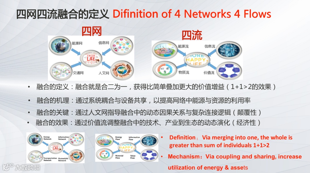“四网”主要包括能源网、信息网、交通网、人文网。人文网是上层建筑,而能源网、信息网、交通网是经济基础,上层建筑和经济基础很好的互动。“四流”主要包括能源流、信息流、物质流、价值流,实现能源、物质和价值的耦合和交流。