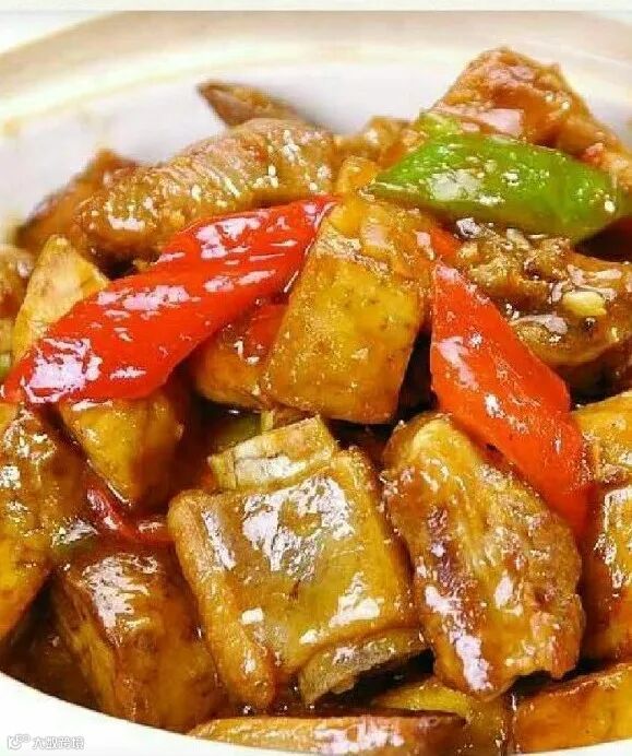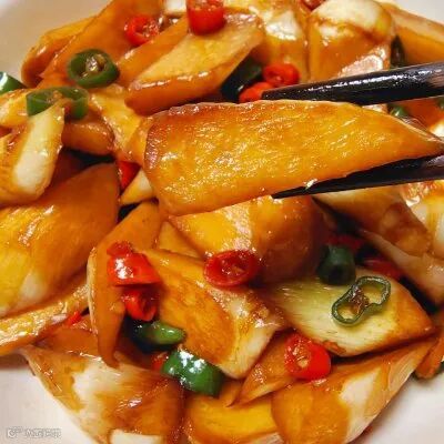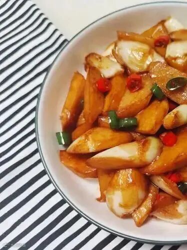 原料:茭白、生抽、老抽、酒、糖。