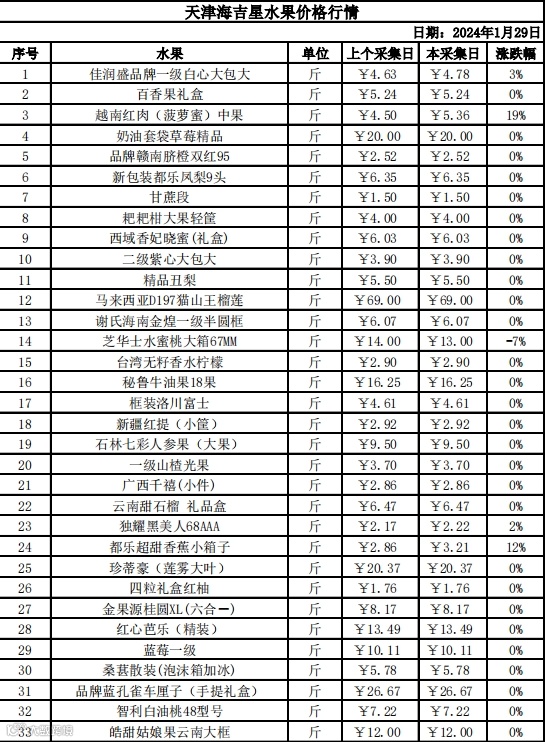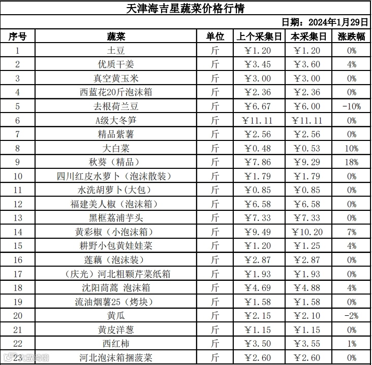 行情丨深农集团天津海吉星2024年1月29日价格行情
