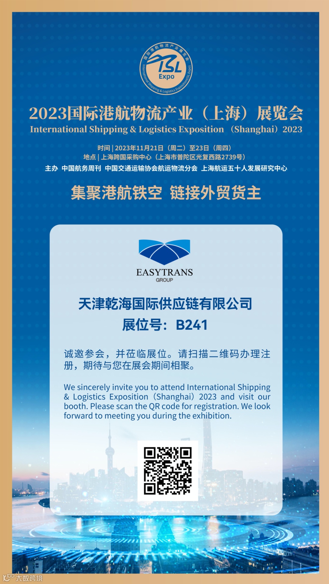 天津乾海国际供应链有限公司将参加在11月21-23日在中国上海举办的“2023国际港航物流产业展览会”(ISL Expo 2023),敬请届时莅临我们的展位!