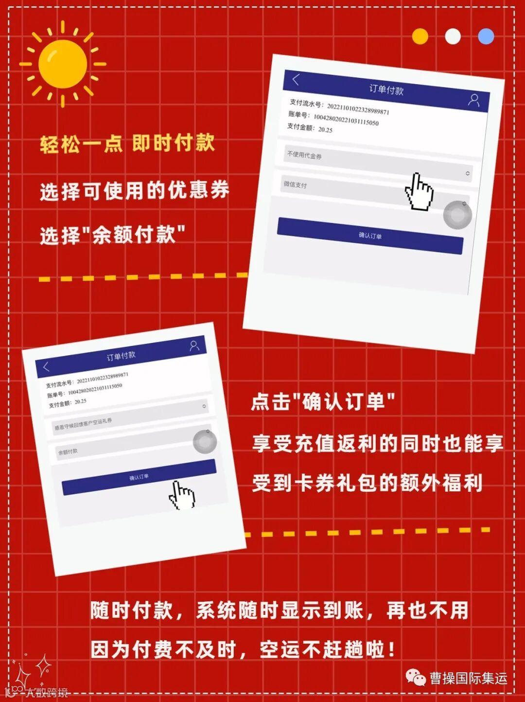 充值金额可在系统"账户余额"中查询。可用于支付曹操物流所有集运线路的运费,并在支付时选择相应的优惠券一起使用。