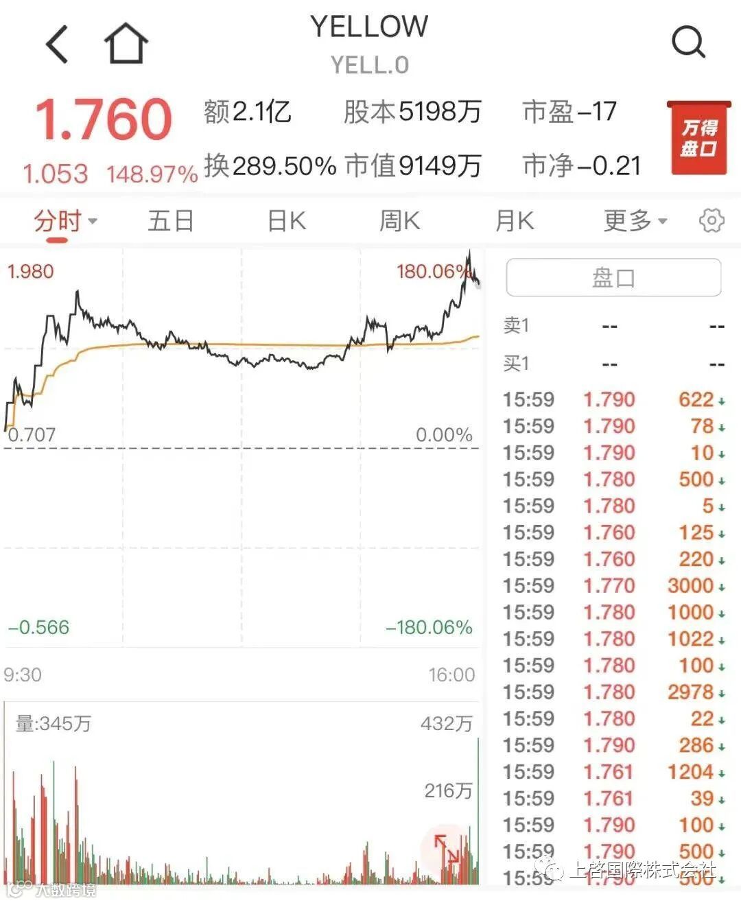 却在宣布倒闭后隔夜,美股收盘,Yellow公司的股价暴涨近49%,有行业人分析:空头回补导致暴涨的可能性比较大。此前,Yellow公司遭空头大举做空,股价持续暴跌,一度跌至0.432美元/股。