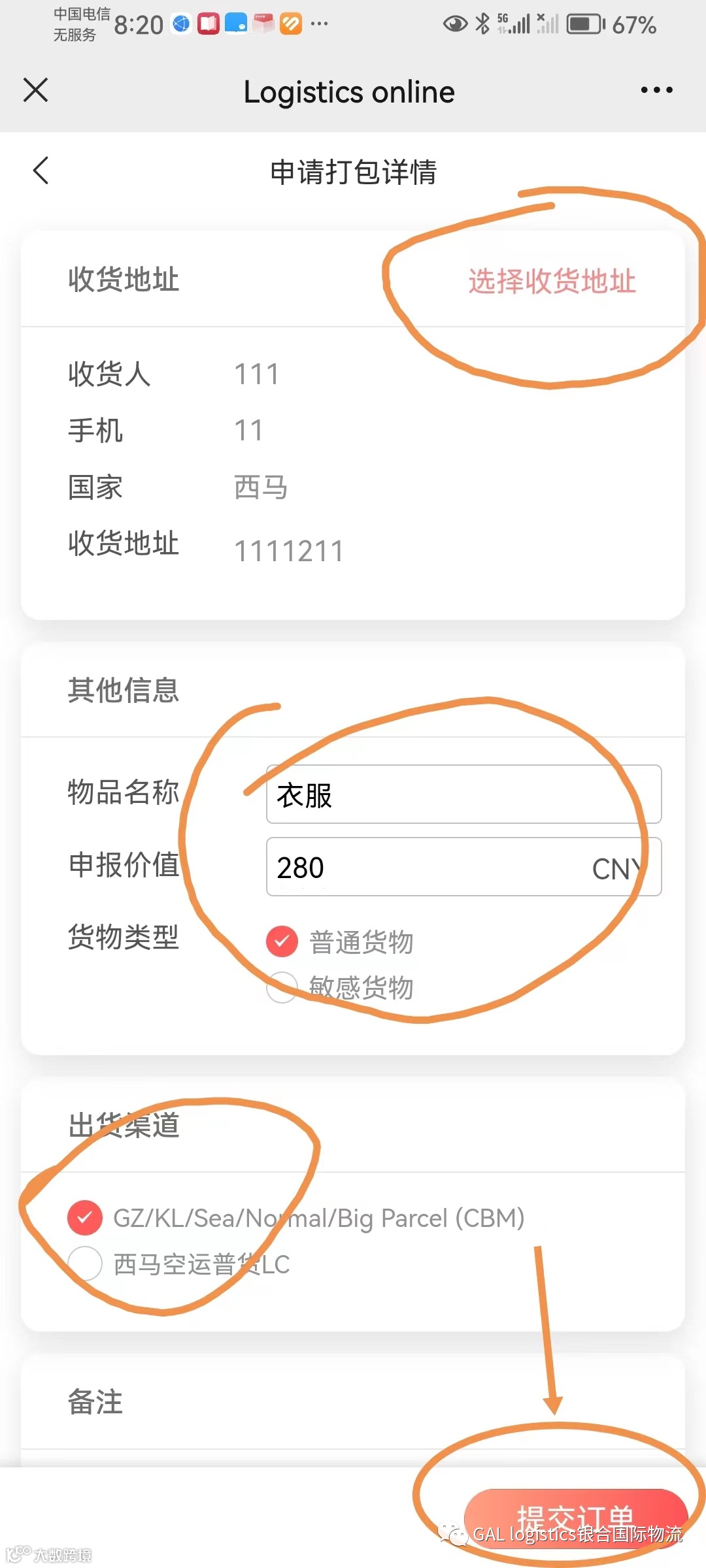 输入国外收货地址,物品名称,货物类型等选项后再次提交订单,就可以完成下单。