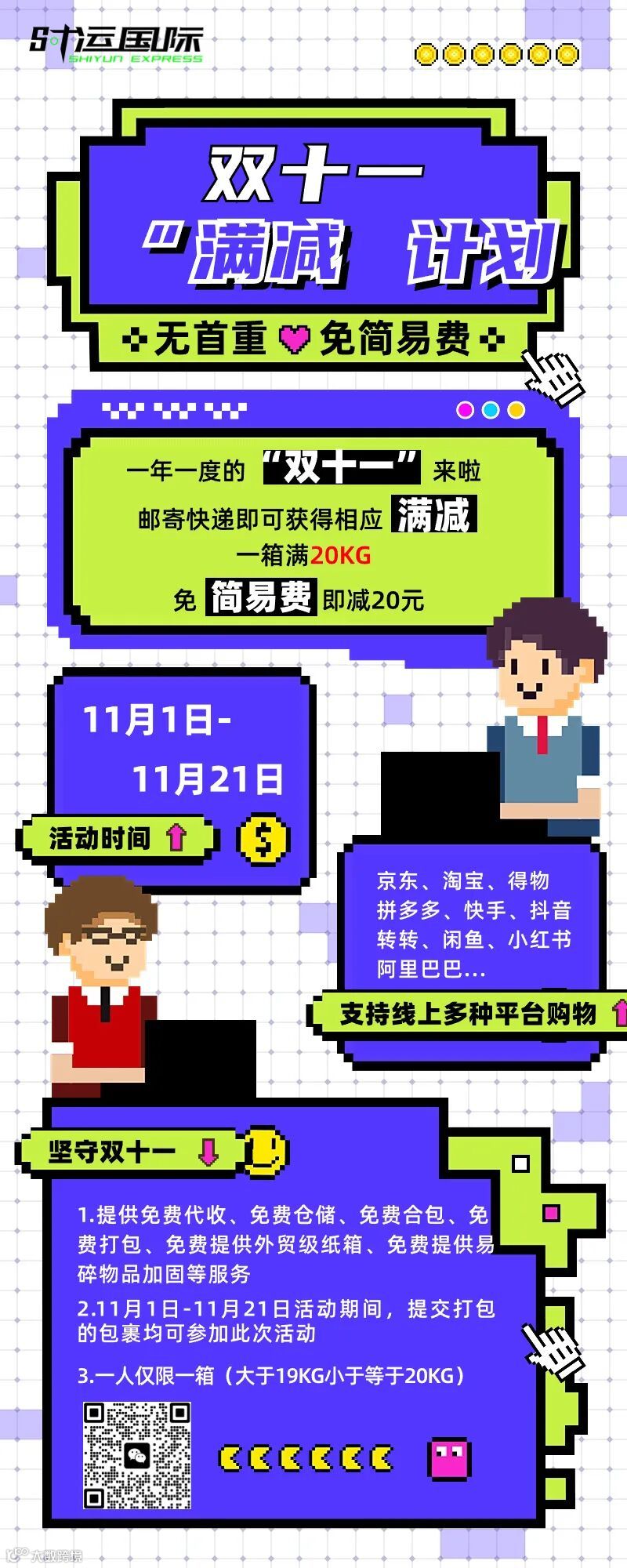 全年“最强满减计划”来啦双11,快来领取最强福利活动吧!在此期间提交打包的包裹均可参与此次活动哦