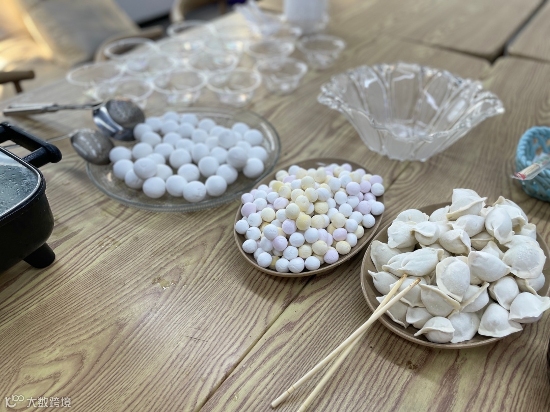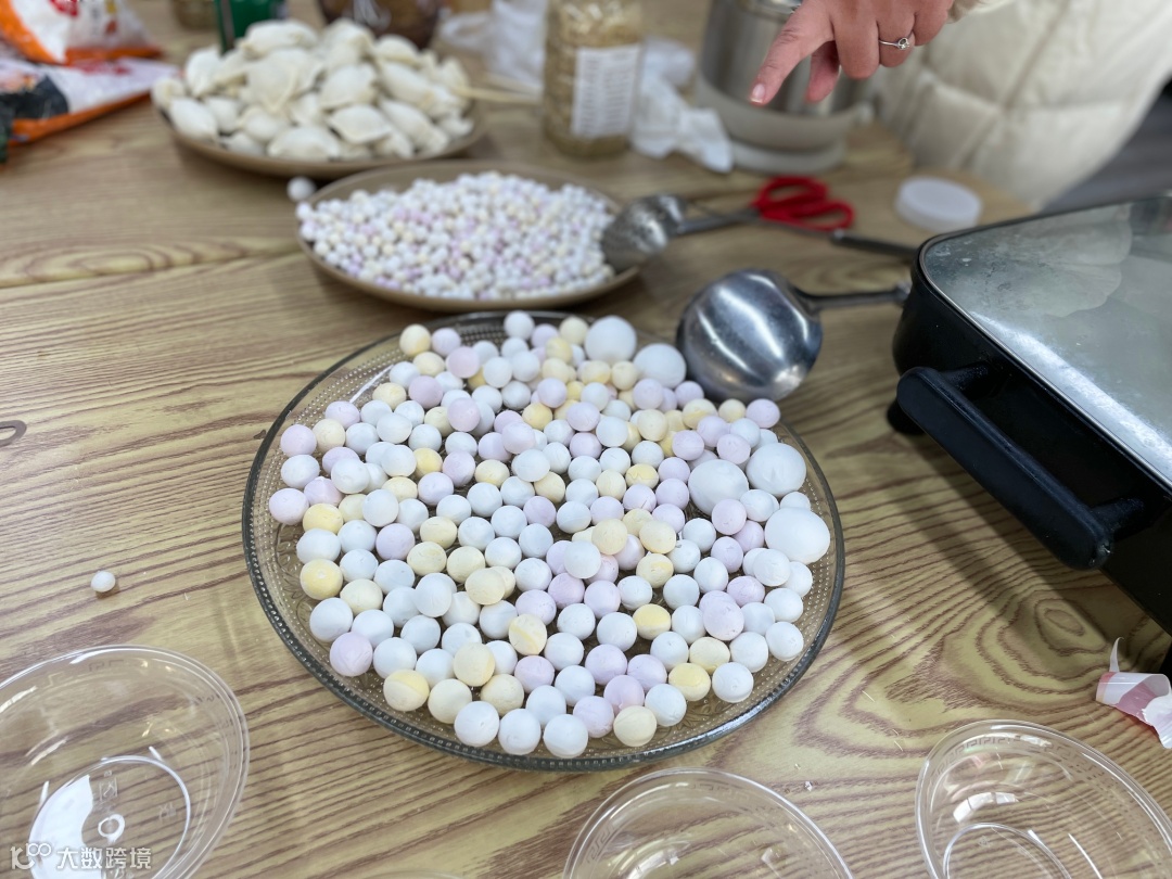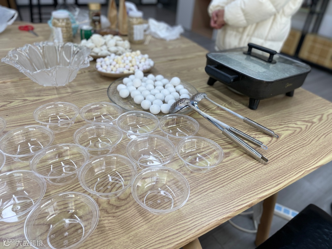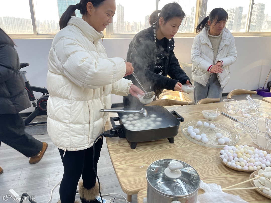 2023年12月22日下午13:30分,财务总监孟总监与公司人事倪主管在公司员工餐厅准备着煮汤圆的食材和餐具,为大家准备了饺子、麻心汤圆、酒酿小丸子和水果汤圆。