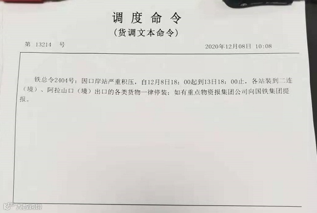 12月8日,铁路总局货调发布最新文本命令:因口岸站积压,自12月8日18:00起到13日18:00止,全路装到二连(境)、阿拉山口(境)出口的各类货物一律停装。重点物资运输需另行向国铁集团提报、沟通。