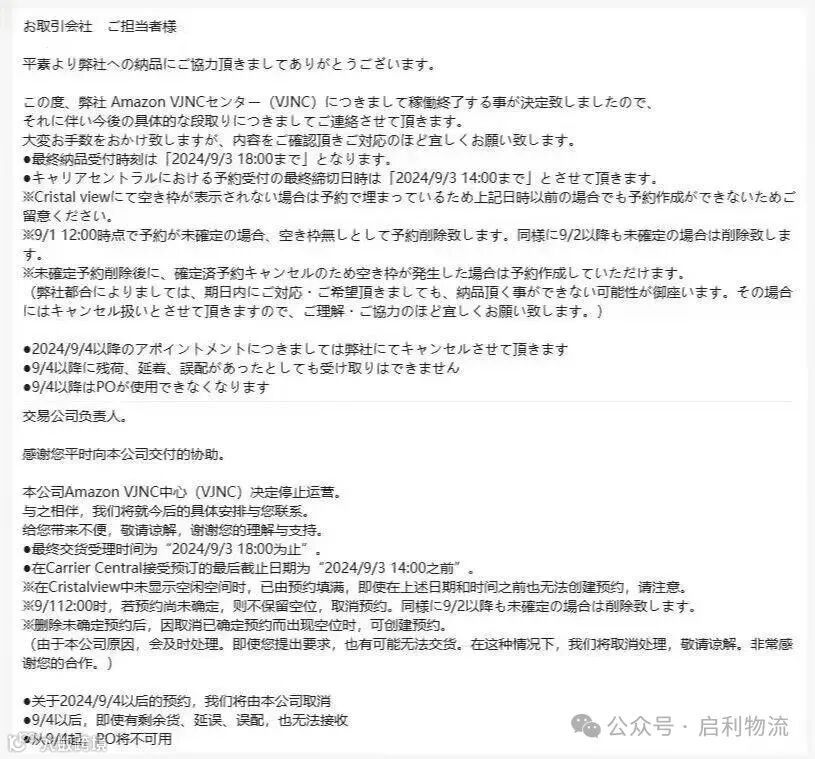 通知:亚马逊日本站VJNC仓库,将于9月3日停止运营,请各位客户避开此仓库建仓,以避免后续错派或拒收,敬请知悉!