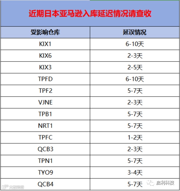 亚马逊购物旺季已经到来,对于日本亚马逊入库的情况,近期我们了解到不同仓库的延迟时间如下: