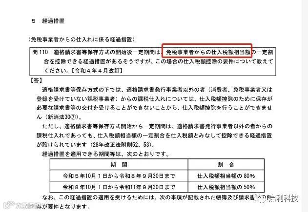 本次消息日本国税厅还提到,在2023年9月30日之前,输入许可通知书上面载有JCT注册对应的卖家公司名称和地址可人全抵扣进项消费税额。2023年10月1之后如果仅仅载有对应的卖家公司名称和地址,但是没有对应卖家的法人番号,则不能获得全额抵扣。在2023年10月1日到2026年9月30日之间可抵扣80%,2026年10月1日至2029年9月30日则只能抵扣50%。