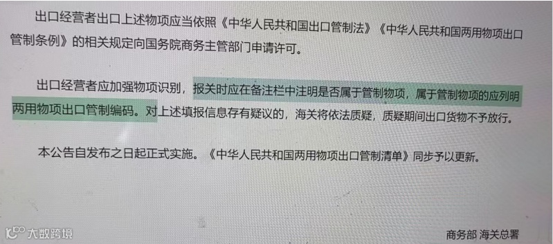 申报的时候需在备注栏中详细备注:此批货物属于2025年第18项联合公告的管制项商品,管制编码:1c905.a.4。