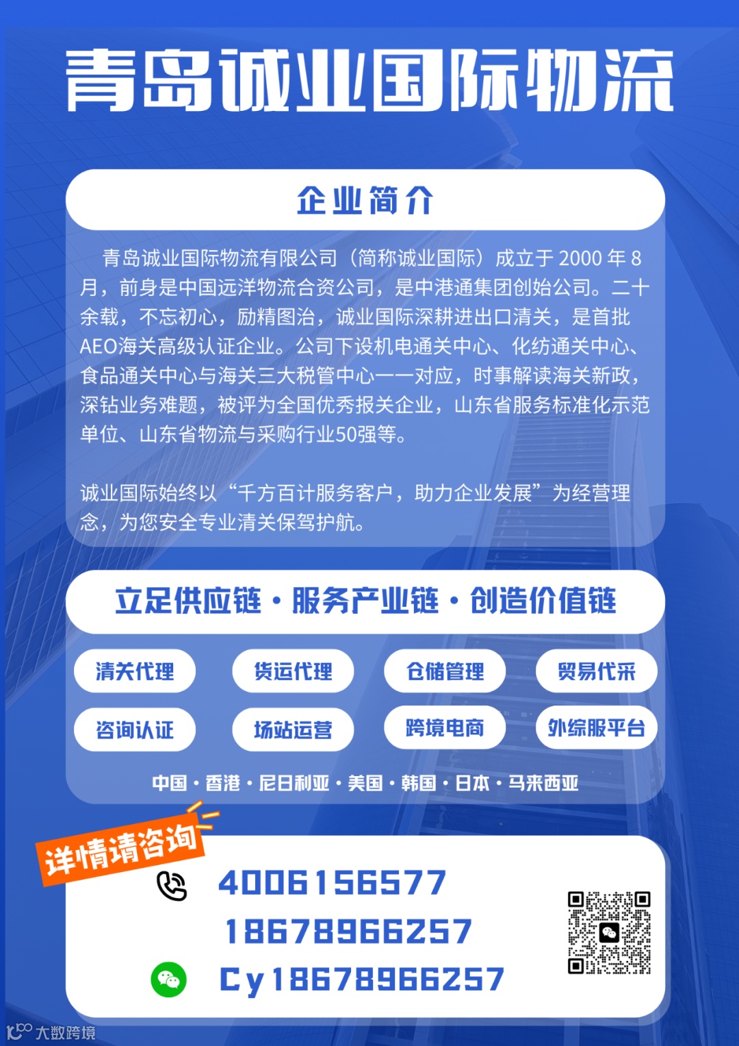 青岛中港诚通供应链有限公司,专注于新能源锂矿类产品的贸易代采代销,借用中港通集团的优势,历经23年的发展,立足供应链,服务产业链。集国际贸易代采、国际货运、供应链金融、第三方物流管理于一体的智慧供应链平台企业。公司终本着“千方百计服务客户,助力企业发展”的理念,可以为源头供应商提供资金支持和项目合作,为贸易商提供供应链代采代销平台服务,为工厂把控源头产品,利用集团完善的网络将货物从产地一站式安全高效的运送到门,定制化供应链物流策划解决方案,专注于为客户提供智慧供应链管理服务。