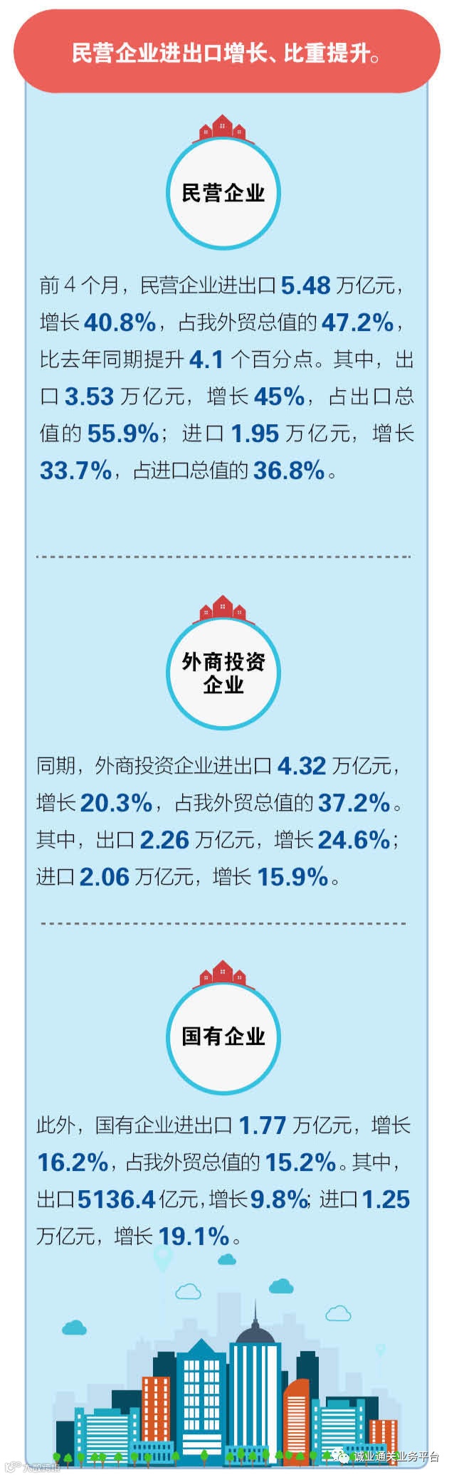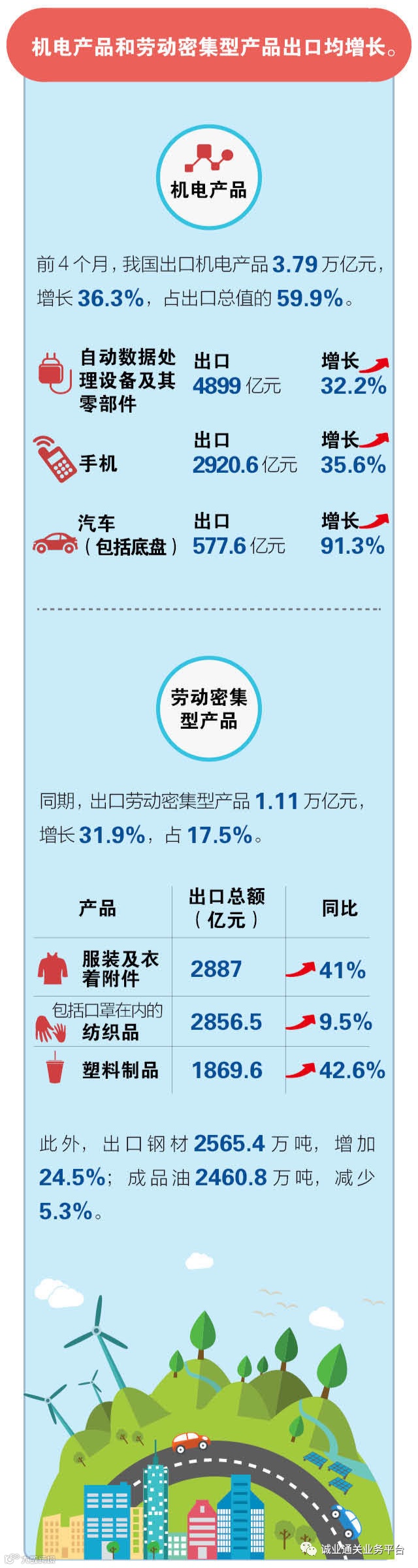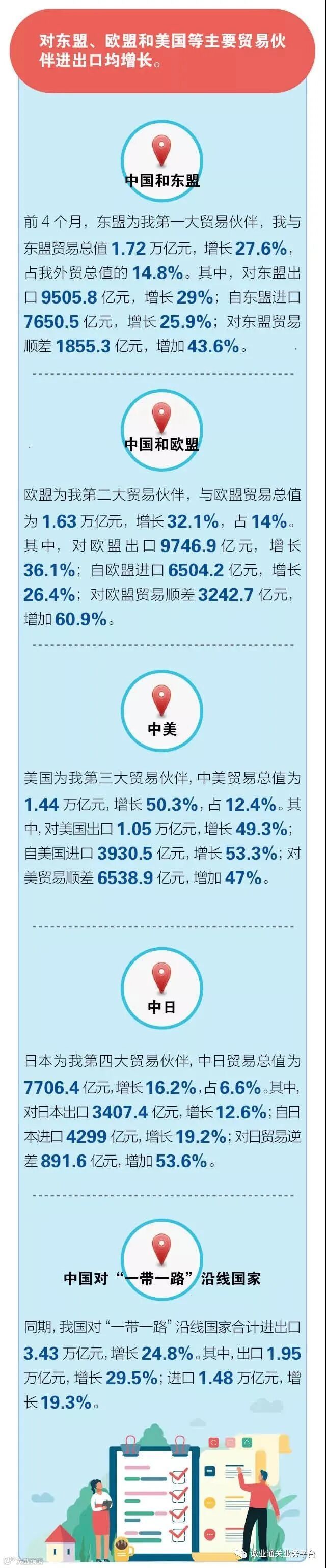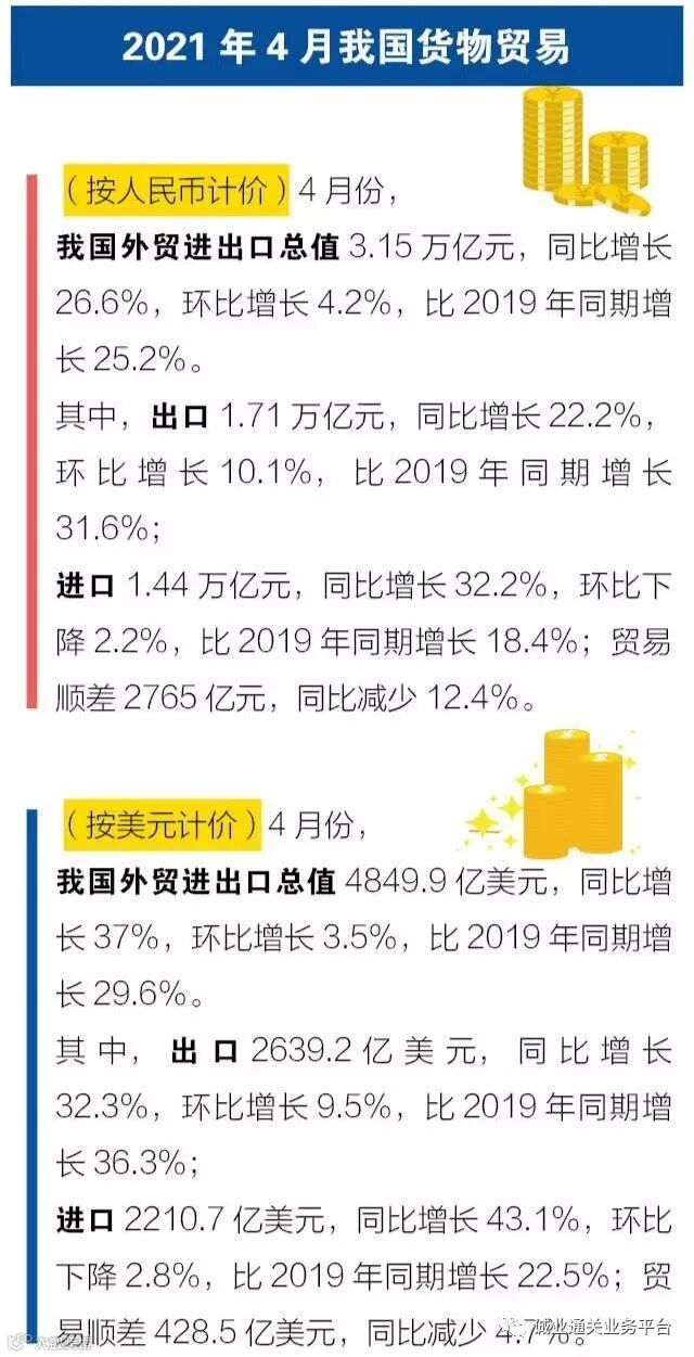 据海关统计,今年前4个月,我国进出口总值11.62万亿元人民币,同比增长28.5%,比2019年同期增长21.8%。其中,出口6.32万亿元,同比增长33.8%,比2019年同期增长24.8%;进口5.3万亿元,同比增长22.7%,比2019年同期增长18.4%;贸易顺差1.02万亿元,同比增加149.7%。
