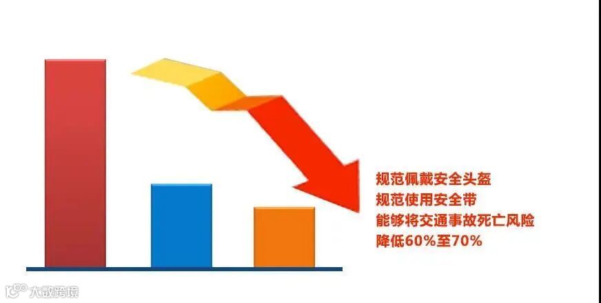 汽车交通事故中,因为不系安全带被甩出车外造成伤亡的事故比比皆是。有关研究表明,正确佩戴安全头盔、规范使用安全带能够将交通事故死亡风险降低60%至70%。