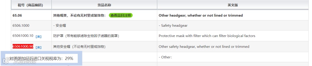 2.加征税率:如原产地是美国,中美贸易战期间,HS编码6506100090在现行适用关税税率的基础上加征25%的关税,即29%。
