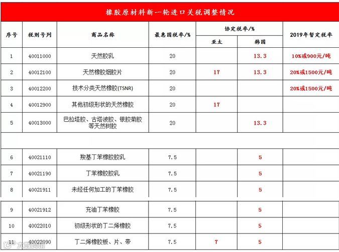 天然橡胶烟胶片及技术分类天然橡胶等原材料继续实行20%或1500元/吨的进口关税政策;但对加入亚太贸易协定的国家其天然橡胶烟胶片、其他初级形态的天然橡胶只征收17%的进口关税;
