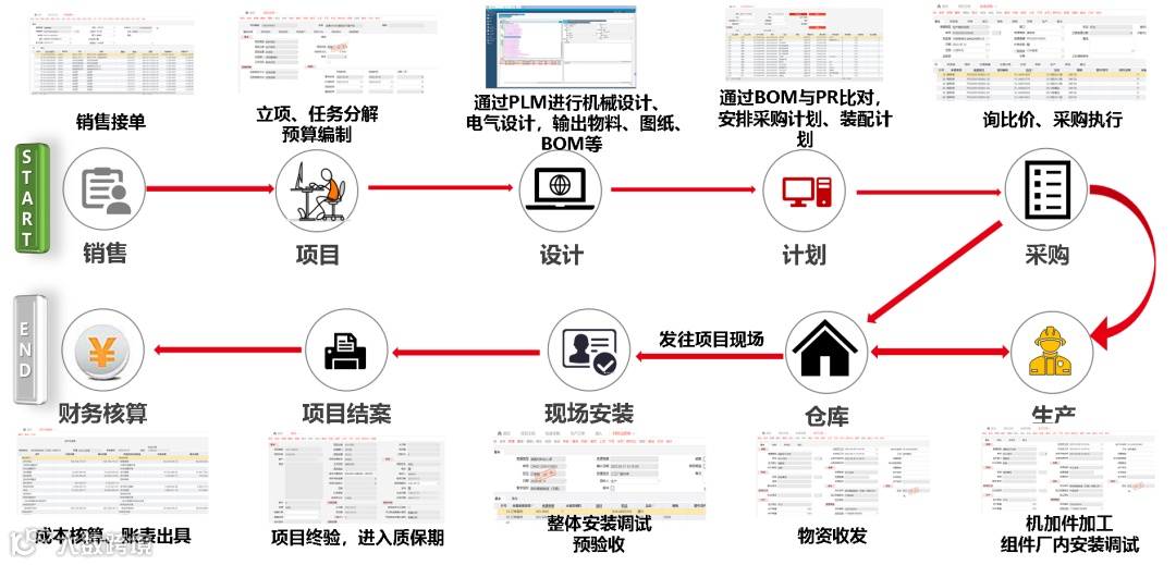 大型装备制造企业普遍具有以下特点:完全按照客户需求进行定制生产,从项目合同签订到交付生产周期较长,短则2-3个月,长则1-2年,客户需求变更多、设计变更多,生产组织难度很大。为了确保交期,一般都是边设计、边采购、边生产,按项目编制研发计划、按项目组织物资采购、按项目安排生产计划、安装调试计划,按项目核算成本……。