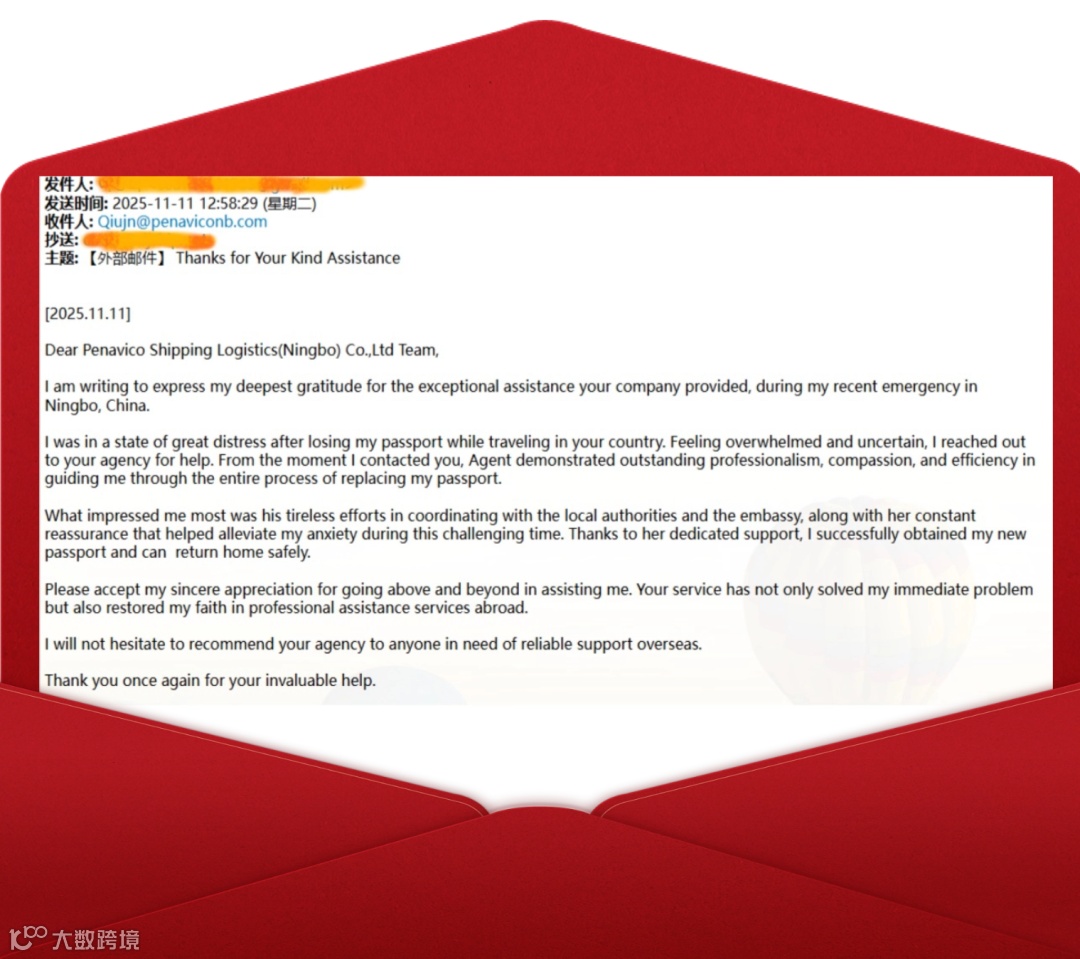 为争取尽快返程,外勤金凯峰于次日清晨专程陪同船员赶赴上海办理临时护照。在当天取得证件后,服务小组又立即着手办妥临时停留签证,并同步敲定了最新返程机票,实现了各环节的无缝衔接。11月13日下午,该船员顺利踏上归程,并发送感谢信对服务小组表达诚挚谢意。