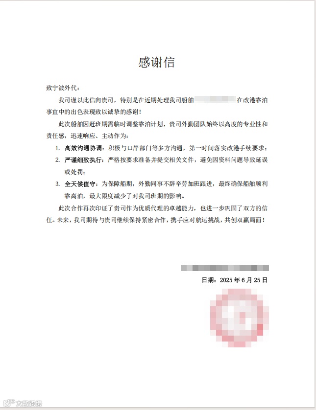 近日,宁波外代收到某重点客户感谢信,对公司高效处置A轮紧急改港宁波事宜所展现的专业服务能力予以高度评价。