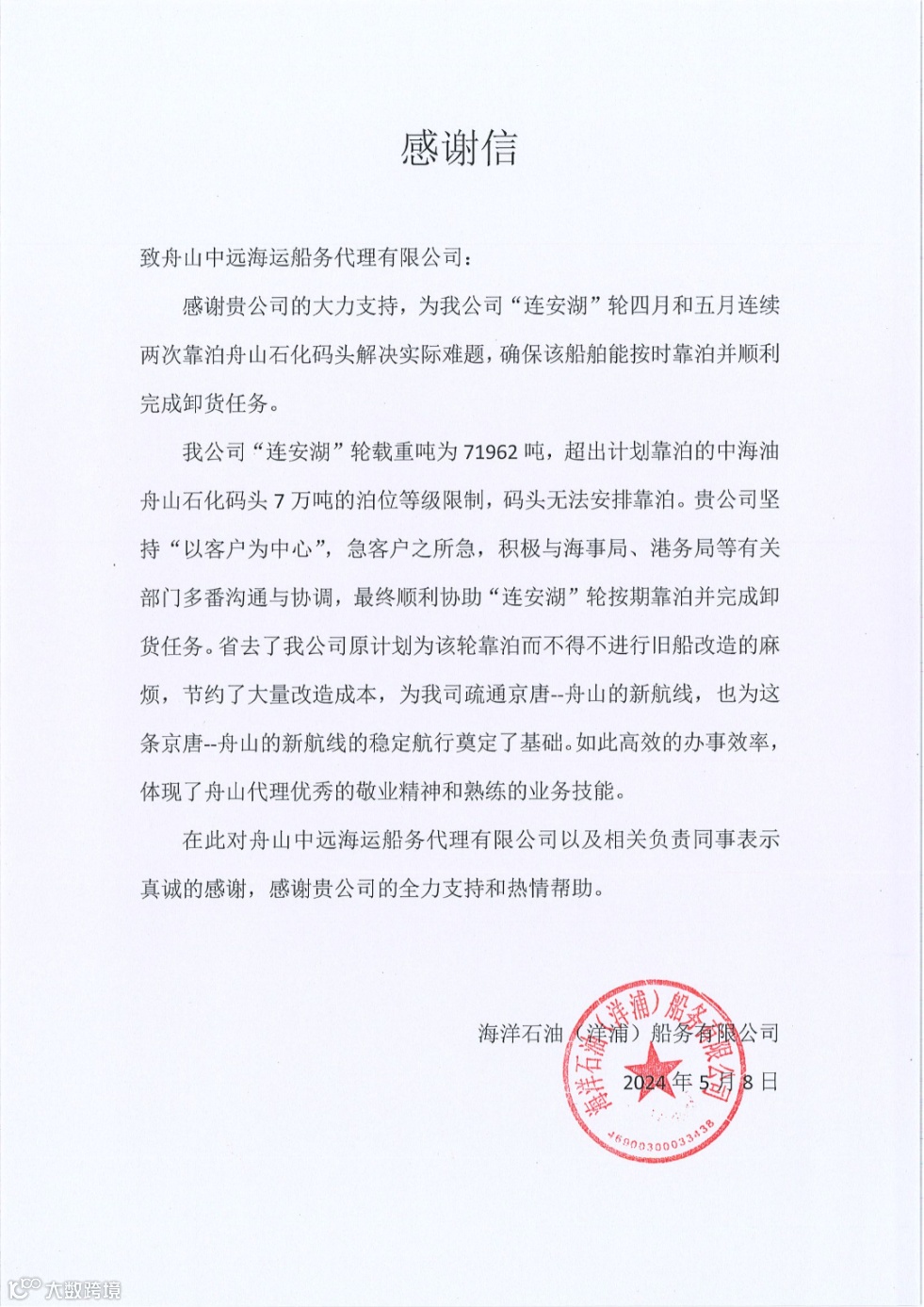 5月8日,舟山船务收到船东发来的感谢信,信中对公司近期连续两次协助“连安湖”轮顺利靠泊表达了感谢。