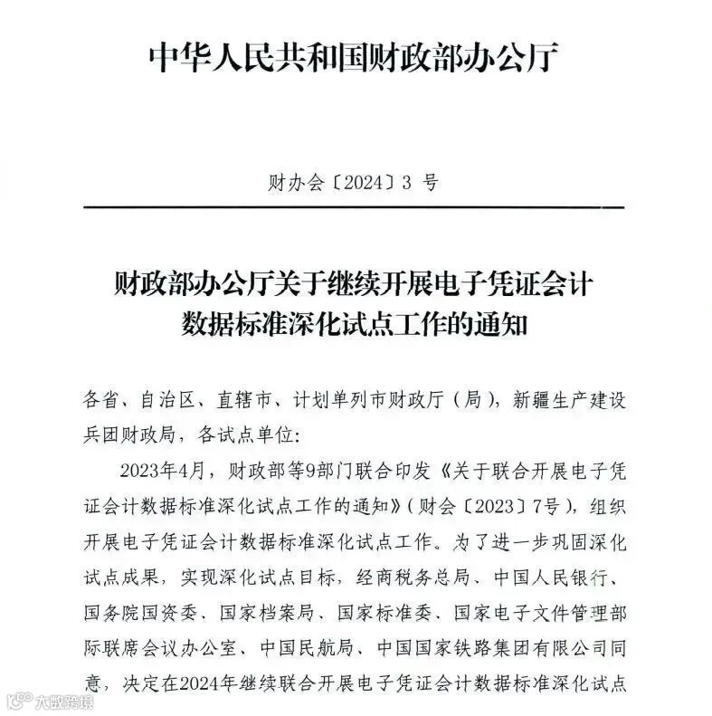 近日,财政部办公厅印发《关于继续开展电子凭证会计数据标准深化试点工作的通知》(财办会[2024]3号),明确2024年继续开展电子凭证会计数据标准深化试点工作的总体安排及工作要求。