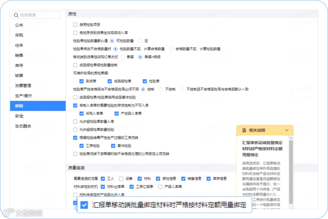 增加【汇报单移动端批量绑定材料时严格按材料定额用量绑定】选项,启用后在工序汇报单移动端批量绑定产品与材料追溯关系时进行相应检查并提示