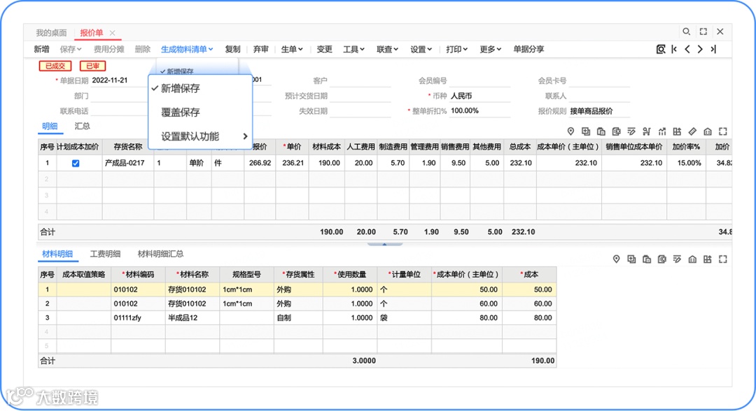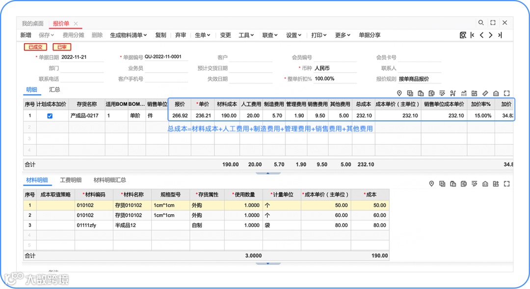 4)系统会根据【报价规则】中设置的料、工、费的取值策略,计算成本信息。即:总成本=材料成本合计+工费成本合计+制造费用+管理费+销售费+其他费用。