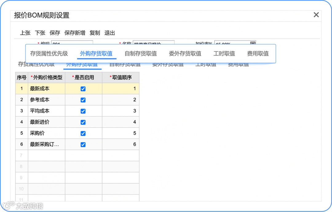在基础档案中,找到【报价BOM规则设置】的档案,按照需求设置材料、工序(如已购买)、费用等取数方式和优先级,用于报价中核算成品的料、工、费的成本,计算成品的销售报价。