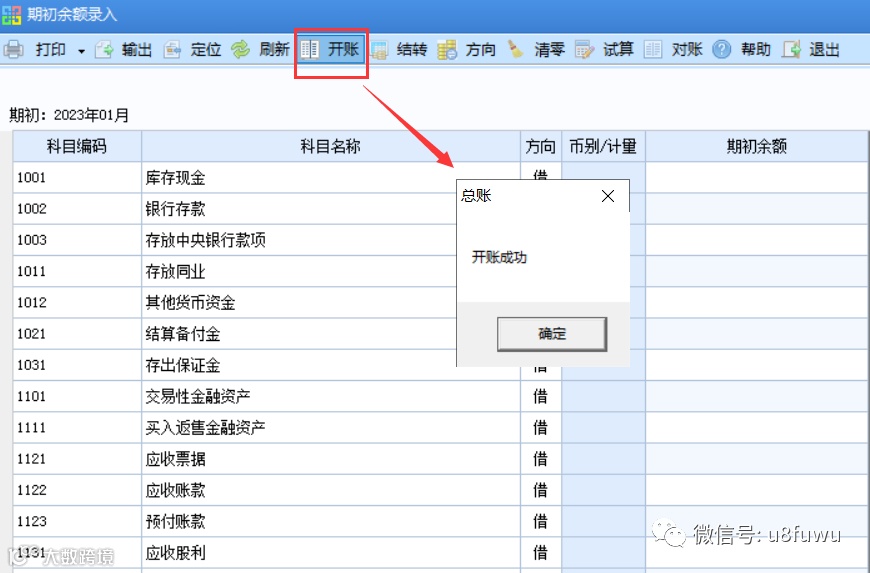 进入总账-期初-期初余额界面,点击“开账”按钮,将上年科目体系结转到本年。