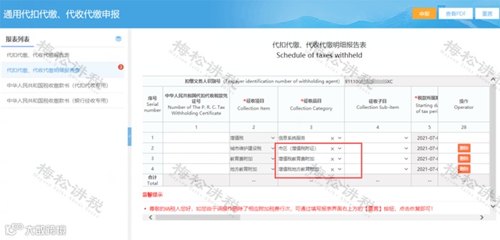 答: 在《代扣代缴、代收代缴明细报告表》第3列“征收品目”下附加税的征收品目中,点击对应叉号(删除),然后重新选择征收品目即可。