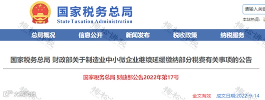 9月14日,国家税务总局 财政部发布2022年第17号公告,宣布自2022年9月1日起,已享受延缓缴纳税50%的制造业中型企业和延缓缴纳税费100%的制造业小微企业,其已缓缴税费的缓缴期限届满后继续延长4个月。