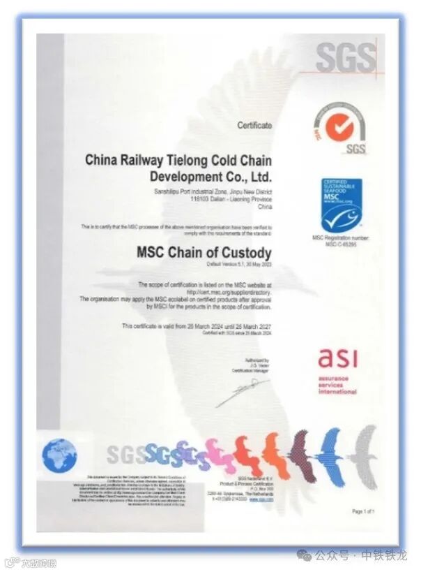 中铁铁龙冷链发展公司获得MSC可持续渔业产销监管链认证