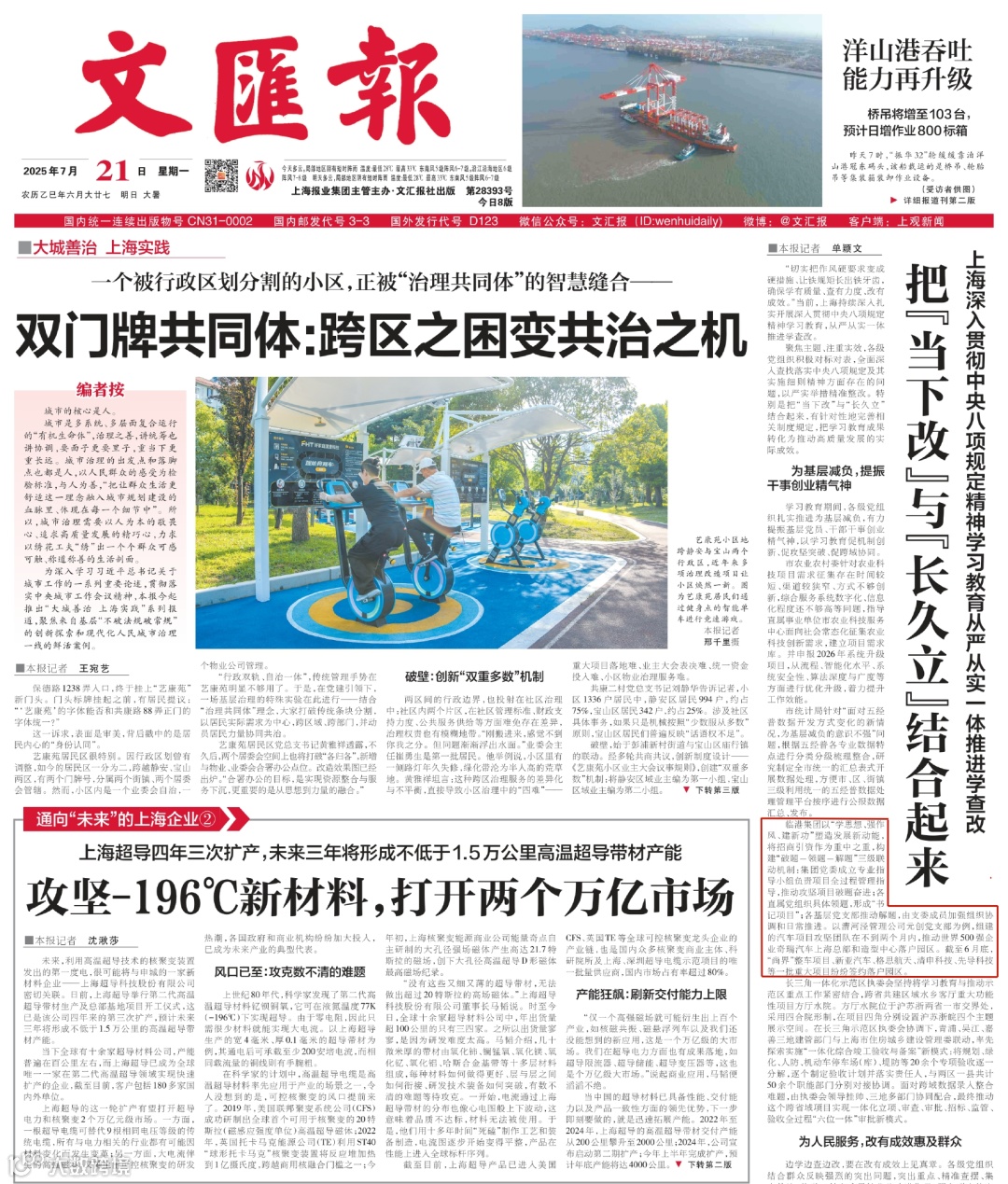 7月21日,《文汇报》头版发布《上海深入贯彻中央八项规定精神学习教育从严从实一体推进学查改——把“当下改”与“长久立”结合起来》,文中报道了临港集团党委认真落实全市“学思想强作风建新功”工作部署,以“攻坚先锋行动”聚力赋能企业改革,以真查实改“新成效”,推动招商安商稳商“新发展”。
