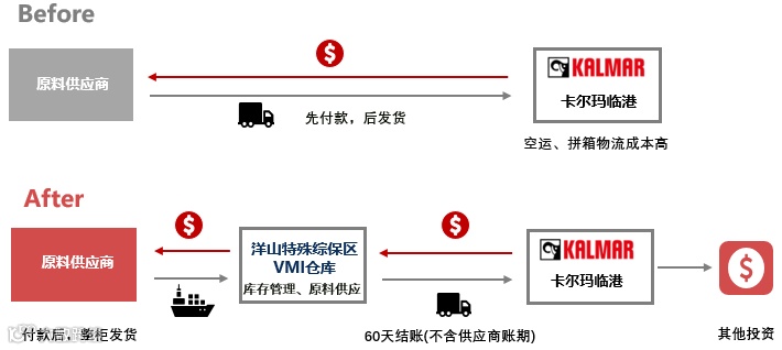根据临港卡哥特科的业务模式特点,综保物流充分发挥洋山特综区的创新政策叠加的功能优势,提出了“海运整批进境+VMI保税管理”的供应链集成解决方案,按实际生产计划按需供给配件的模式,有效降低了临港新片区工厂配件库存管理压力及资金占用、提升了经济效益。