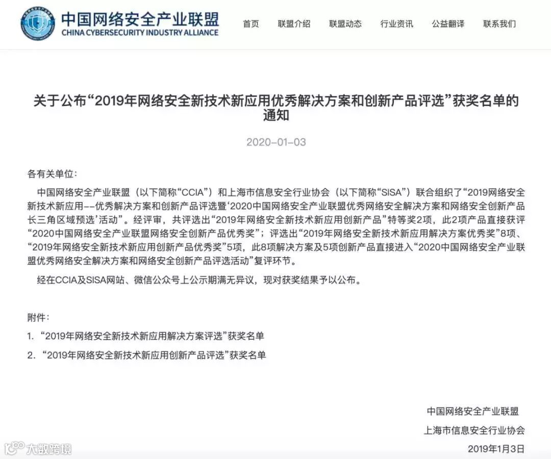 此次评选共选出“2019年网络安全新技术新应用创新产品”特等奖2项,此2项产品直接获评“2020中国网络安全产业联盟网络安全创新产品优秀奖”;评选出“2019年网络安全新技术新应用解决方案优秀奖”8项、“2019年网络安全新技术新应用创新产品优秀奖”5项,此8项解决方案及5项创新产品直接进入“2020中国网络安全产业联盟优秀网络安全解决方案和网络安全创新产品评选活动”复评环节。